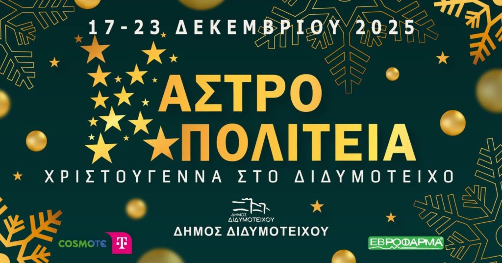 Συναυλία με τον Γιώργο Τσαλίκη και ελεύθερη είσοδος στη μεγάλη γιορτή του Δήμου, την Τετάρτη 17 Δεκεμβρίου Σε χριστουγεννιάτικους ρυθμούς μπαίνει το Διδυμότειχο, καθώς ο Δήμος προσκαλεί μικρούς και μεγάλους στη φετινή τελετή φωταγώγησης του Χριστουγεννιάτικου Δέντρου, που θα πραγματοποιηθεί την Τετάρτη 17 Δεκεμβρίου 2025, στον στολισμένο χώρο μπροστά από το Τμήμα Ψυχολογίας του Δημοκριτείου […]