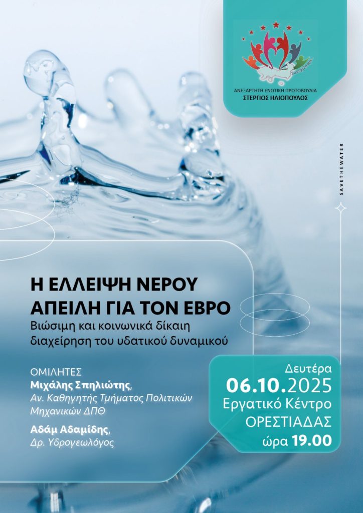 Η Ανεξάρτητη Ενωτική Πρωτοβουλία καλεί τους πολίτες σε συζήτηση τη Δευτέρα 6 Οκτωβρίου στην Ορεστιάδα – Κεντρικό μήνυμα ότι «το νερό είναι δημόσιο αγαθό». Το ζήτημα της έλλειψης νερού στον Έβρο τίθεται με ολοένα και πιο πιεστικούς όρους, με την Ανεξάρτητη Ενωτική Πρωτοβουλία να αναλαμβάνει την πρωτοβουλία να ανοίξει τον δημόσιο διάλογο γύρω από τη […]