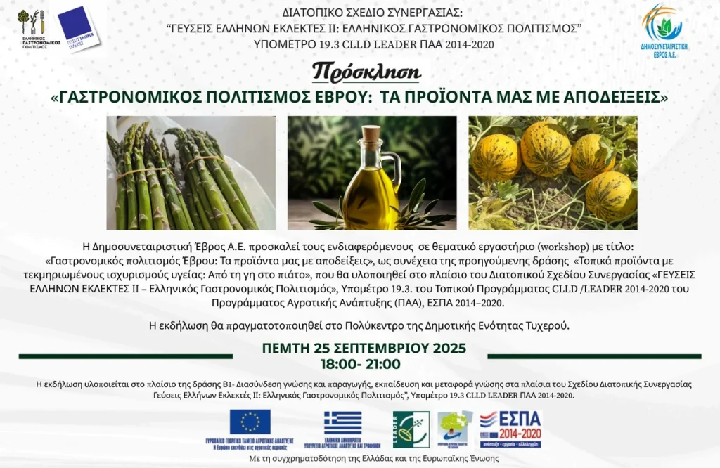 «Γαστρονομικός πολιτισμός Έβρου: Τα προϊόντα μας με αποδείξεις» – Ανάδειξη τοπικών προϊόντων και διατροφικής ταυτότητας της περιοχής Η Δημοσυνεταιριστική Έβρος Α.Ε. προσκαλεί τους ενδιαφερόμενους να συμμετάσχουν σε θεματικό εργαστήριο (workshop) με θέμα: «Γαστρονομικός πολιτισμός Έβρου: Τα προϊόντα μας με αποδείξεις», το οποίο εντάσσεται στη δράση Β1 – Διασύνδεση γνώσης και παραγωγής, εκπαίδευση και μεταφορά γνώσης στα πλαίσια […]