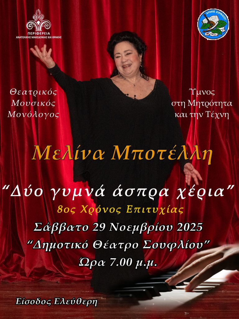 Μια παράσταση–ύμνος στην προσφορά, την αγάπη και το φως της ανθρώπινης ψυχής παρουσιάζεται στο Δημοτικό Θέατρο Σουφλίου το Σάββατο 29 Νοεμβρίου Η Περιφέρεια Ανατολικής Μακεδονίας και Θράκης, σε συνεργασία με τον Δήμο Σουφλίου, υποδέχεται μία από τις πιο ξεχωριστές μορφές του ελληνικού θεάτρου, τη Μελίνα Μποτέλλη, η οποία θα παρουσιάσει τον πολυταξιδεμένο θεατρικό μουσικό της […]