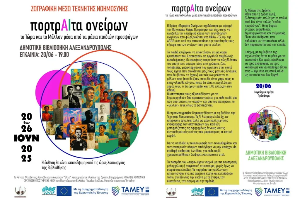 Μία πρωτότυπη και ενδιαφέρουσα δράση διοργανώνει το Κέντρο Φιλοξενίας Ασυνόδευτων Ανηλίκων «Έλλη» της ΑΡΣΙΣ – Κοινωνική Οργάνωση Υποστήριξης Νέων, στην Αλεξανδρούπολη, με την υποστήριξη της Δημοτικής Βιβλιοθήκης. Πρόκειται για την Έκθεση Ζωγραφικής που φιλοξενείται από τη Δημοτική Βιβλιοθήκη Αλεξανδρούποληςαπό 20-26 Ιουνίου 2025. Οι αυτοπροσωπογραφίες που θα εκτεθούν δημιουργήθηκαν με τη βοήθεια της Τεχνητής Νοημοσύνης και απεικονίζουν είκοσι φιλοξενούμενους του Κέντρου Φιλοξενίας […]