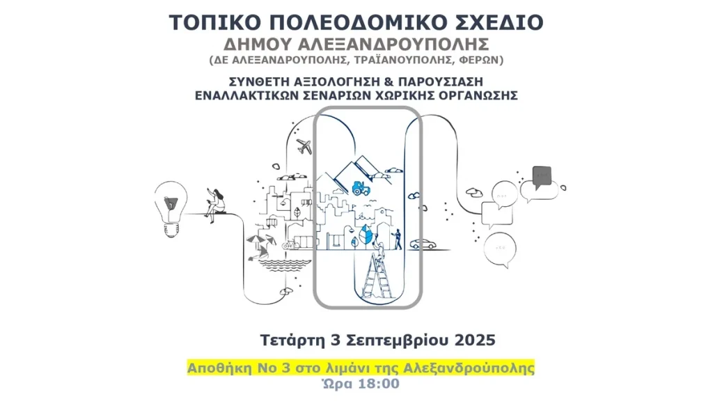 Ο Δήμος παρουσιάζει τα εναλλακτικά σενάρια του Τοπικού Πολεοδομικού Σχεδίου – Πρόσκληση σε πολίτες και φορείς Ο Δήμος Αλεξανδρούπολης, στο πλαίσιο της εκπόνησης της μελέτης «Τοπικό Πολεοδομικό Σχέδιο (ΤΠΣ) Δήμου Αλεξανδρούπολης (Δ.Ε. Αλεξανδρούπολης, Τραϊανούπολης, Φερών)», διοργανώνει ανοιχτή εκδήλωση για την παρουσίαση των εναλλακτικών σεναρίων χωρικής οργάνωσης του Δήμου. Η εκδήλωση θα πραγματοποιηθεί την Τετάρτη 3 Σεπτεμβρίου 2025, στις 18:00, στην Αποθήκη Νο 3 στο […]