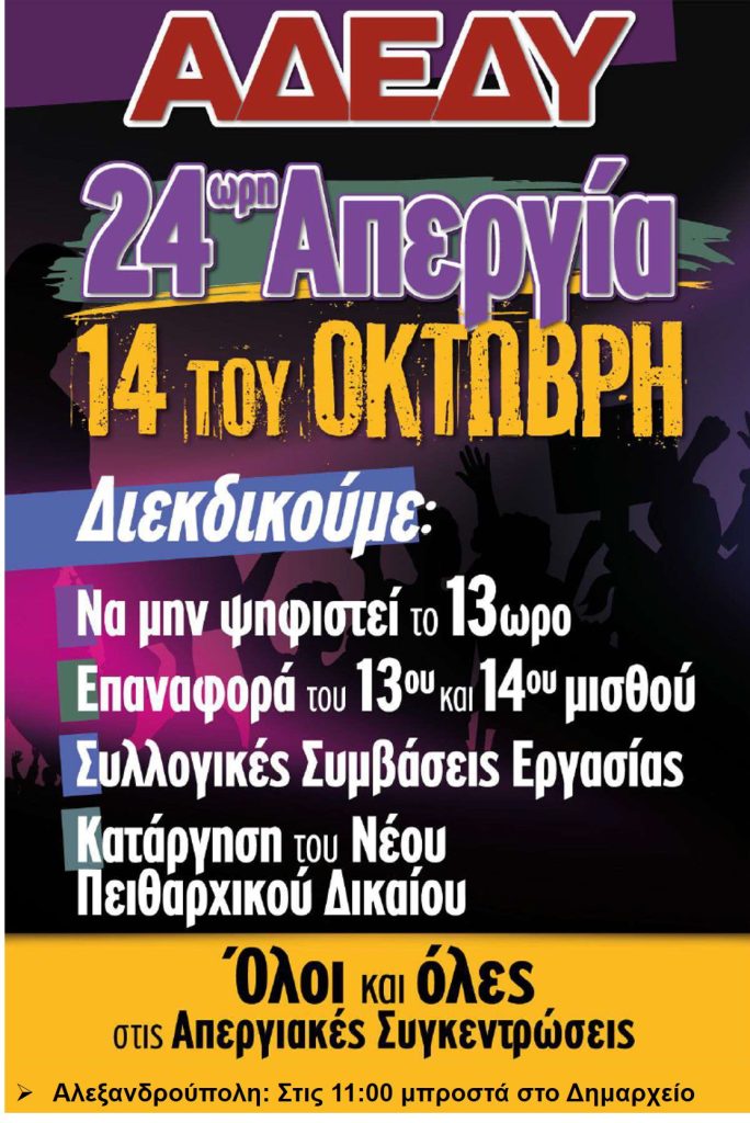 Μαζικό κάλεσμα της ΑΔΕΔΥ Έβρου για την 24ωρη Πανελλαδική Απεργία της 14ης Οκτωβρίου