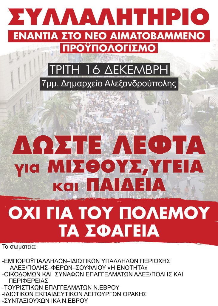 Όχι στον “αιματοβαμμένο” προϋπολογισμό – Κάλεσμα σε συγκέντρωση την Τρίτη 16 Δεκεμβρίου στο Δημαρχείο Αλεξανδρούπολης