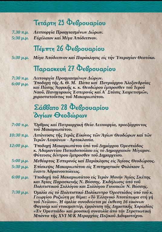 Η εορτή των Αγίων Θεοδώρων αποτελεί σημείο αναφοράς για την Ορεστιάδα, καθώς συνδέεται άρρηκτα με την ταυτότητα και την ιστορική διαδρομή της πόλης. Η τοπική κοινωνία προετοιμάζεται να υποδεχθεί τον υψηλό προσκεκλημένο και να τιμήσει με ευλάβεια τους προστάτες της πόλης.