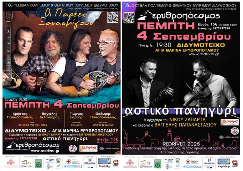 Το Φεστιβάλ Πολιτισμού και Θεματικού Τουρισμού Ερυθροπόταμος – REDRIVER 2025 επιστρέφει δυναμικά την Πέμπτη 4 Σεπτεμβρίου στο Διδυμότειχο, υποσχόμενο μια αξέχαστη μουσική βραδιά. Από τις 19:30, στην περιοχή Αγία Μαρίνα, κάτω από τους βράχους και με θέα το ιστορικό κάστρο της πόλης, διοργανώνεται το «Αστικό Πανηγύρι», ένα μοναδικό γεγονός που ενώνει μουσικές, φίλους και γενιές.