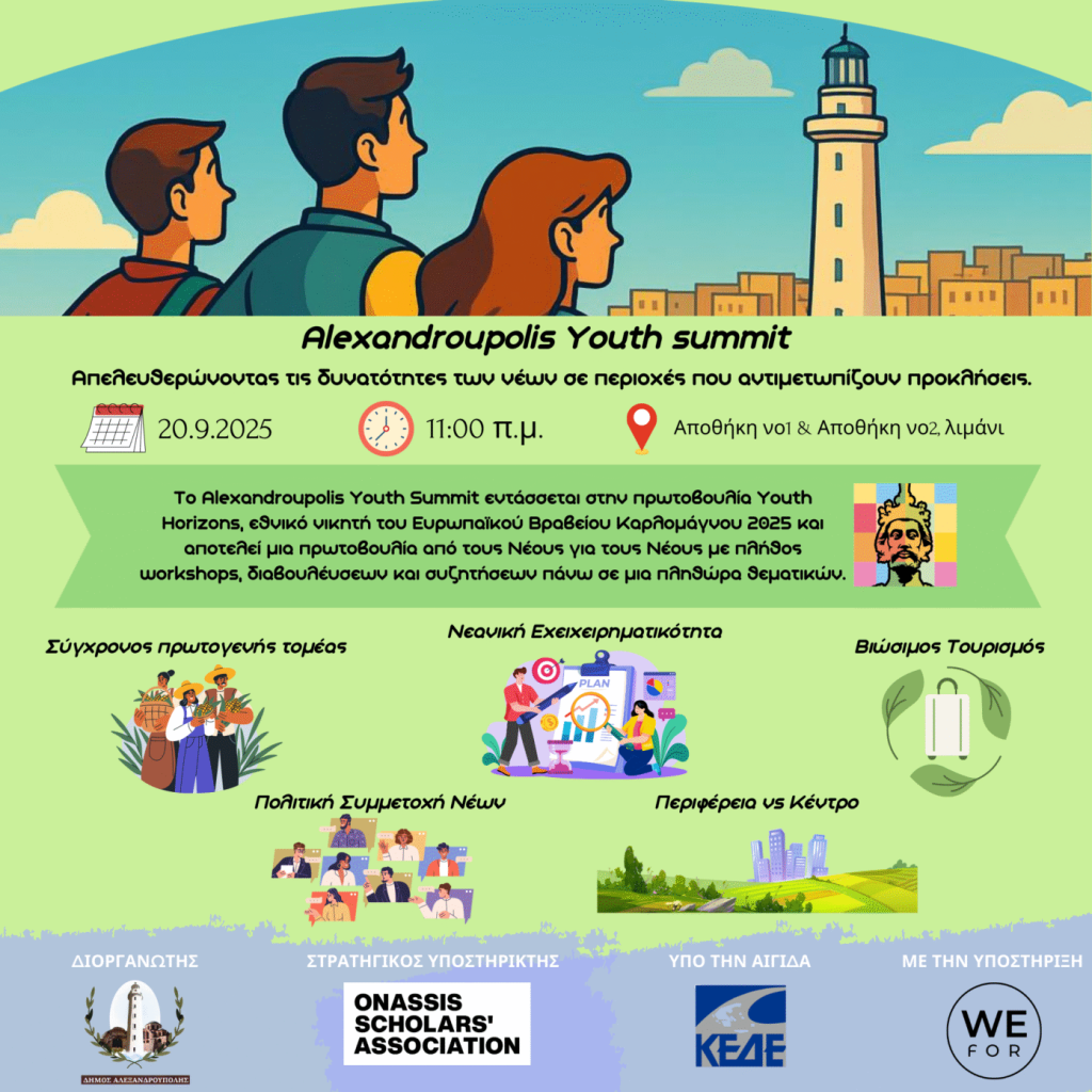 Με το Youth Summit στην Αλεξανδρούπολη, η νεολαία αναδεικνύεται σε πρωταγωνιστή της ζωής της πόλης. Πρόκειται για μια δράση που δεν περιορίζεται στη θεωρητική συζήτηση, αλλά φιλοδοξεί να δημιουργήσει ένα δίκτυο νέων ενεργών πολιτών, έτοιμων να συνεισφέρουν στη διαμόρφωση ενός καλύτερου μέλλοντος για την τοπική κοινωνία.